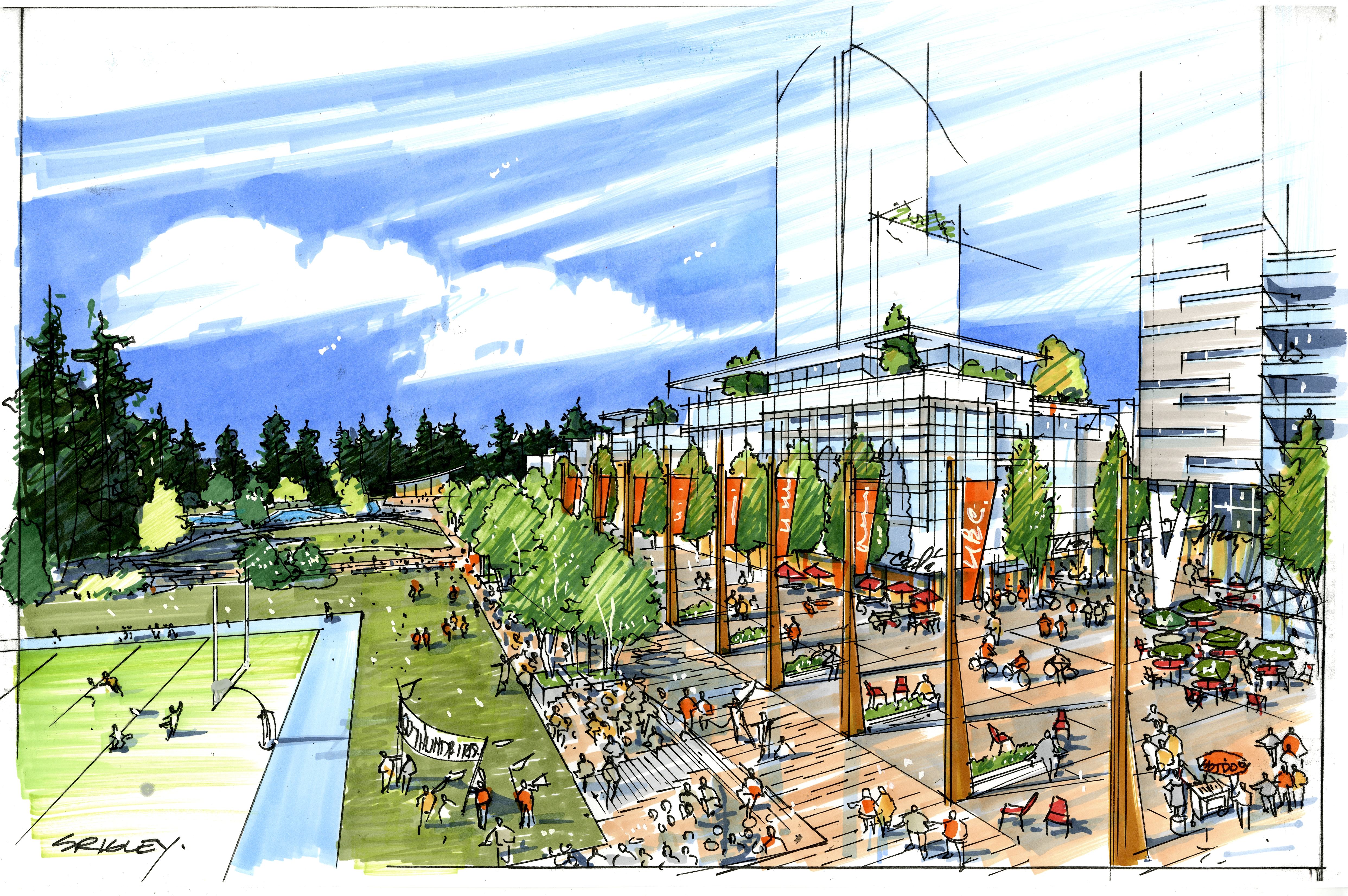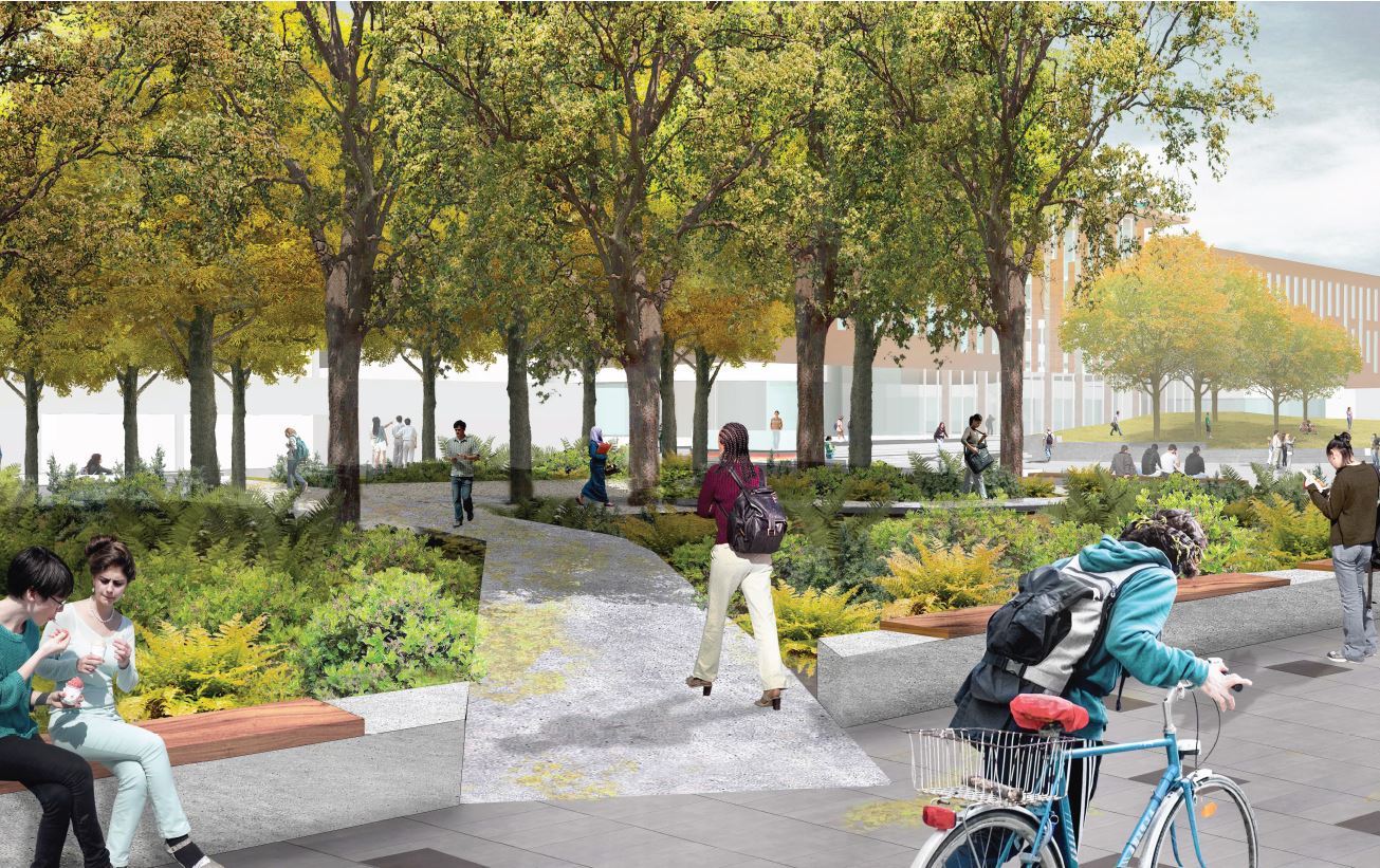 The Vision ensures that everyone on campus will be within easy walking or rolling distance to a network of open spaces that knit the campus together. Varying in size, function and character, these spaces will enhance health and wellbeing, community resiliency and biodiversity, and support new and innovative ways of learning.